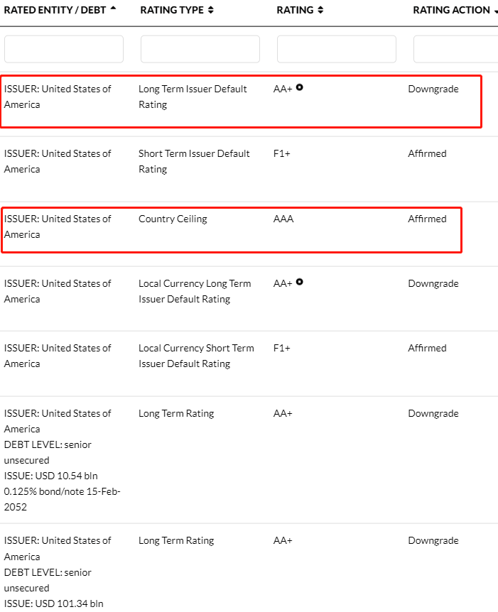 隔夜美国市场意外遭遇“黑天鹅”。当地时间8月1日,全球评级巨头惠誉突然宣布,将美国长期外币债务评级从AAA下调至AA+。这是惠誉自1994年首次发布美国信用评级以来第一次对该国的评级下调。