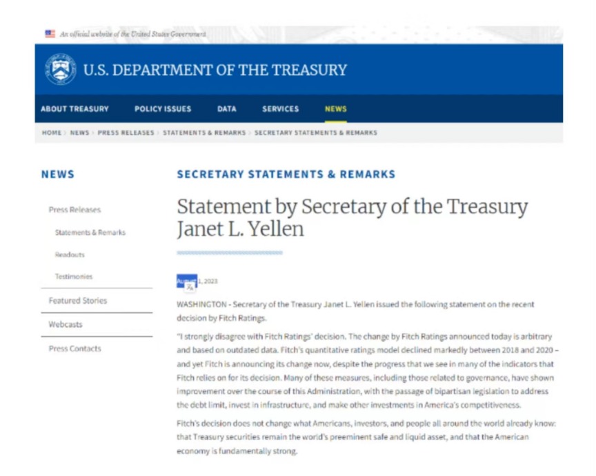 她在一份声明中表示,惠誉的决定并没有改变美国人、投资者和世界各地的人们已经知道的事实:美国国债仍然是世界上最安全和流动性最高的资产,而且美国经济从根本上来说是强劲的。