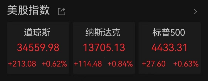 当地时间8月28日,美股主要股指延续前一交易日涨势,集体收获两连涨。截至收盘,美股道指涨0.62%,报34559.98点;纳指涨0.84%,报13705.13点;标普500指数涨0.63%,报4433.31点。