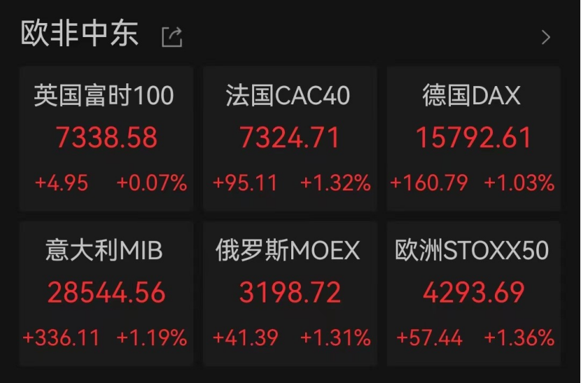 欧洲股市方面,多数股指同样迎来上涨:截至收盘,英国富时100指数、法国CAC40指数、德国DAX指数分别上涨0.07%、1.32%、1.03%。